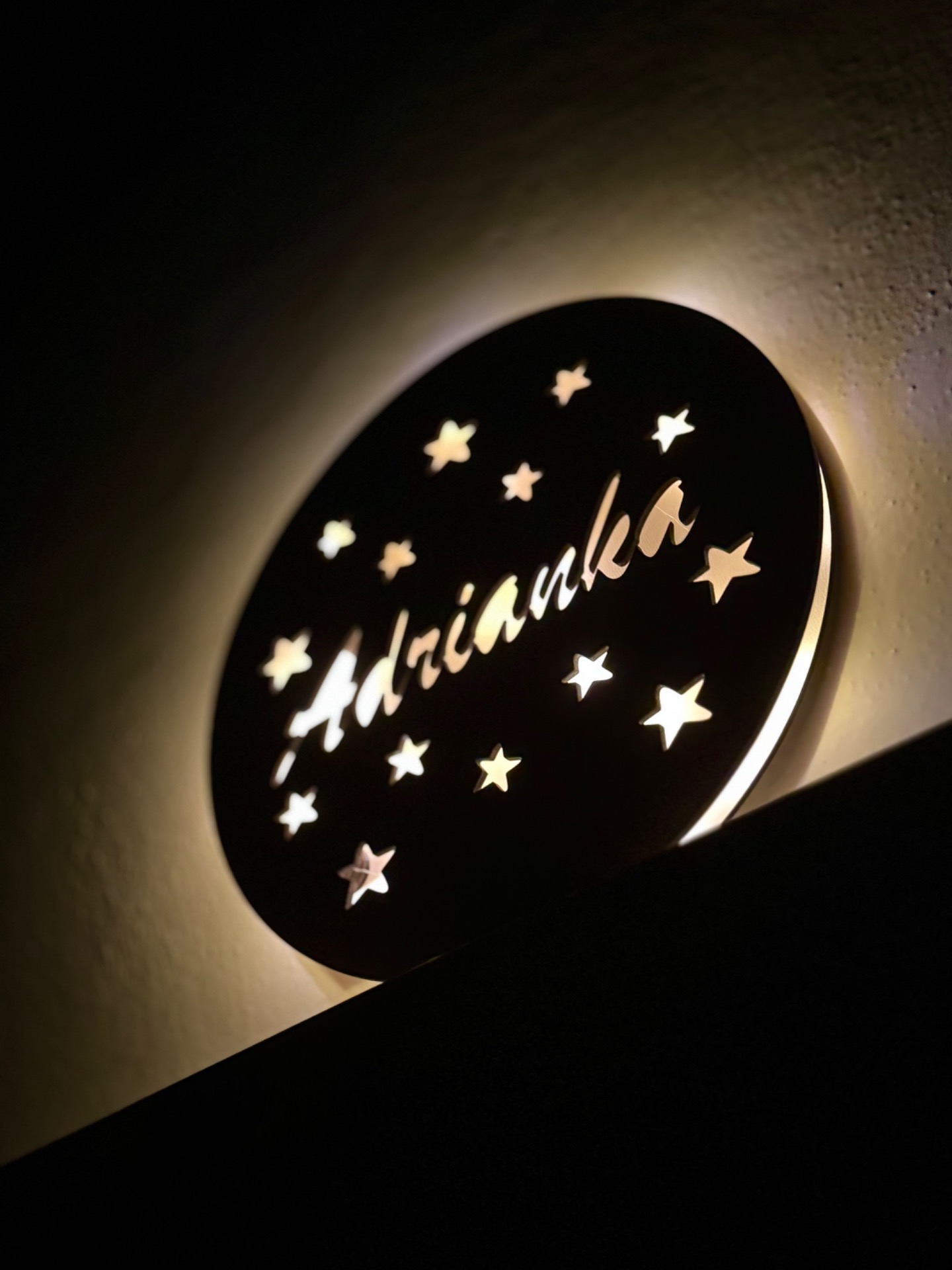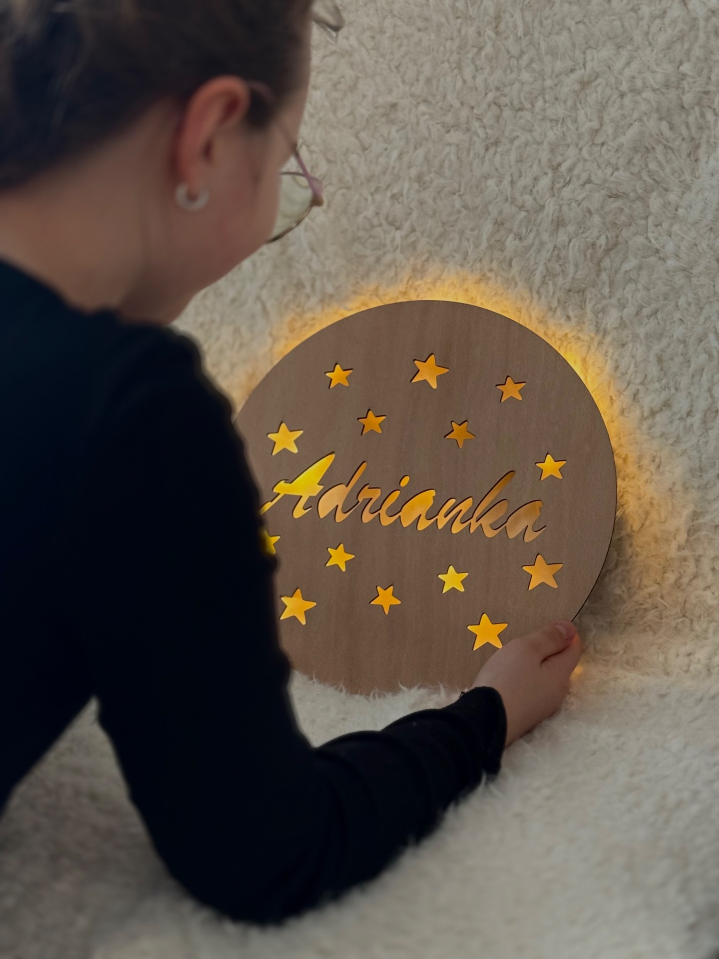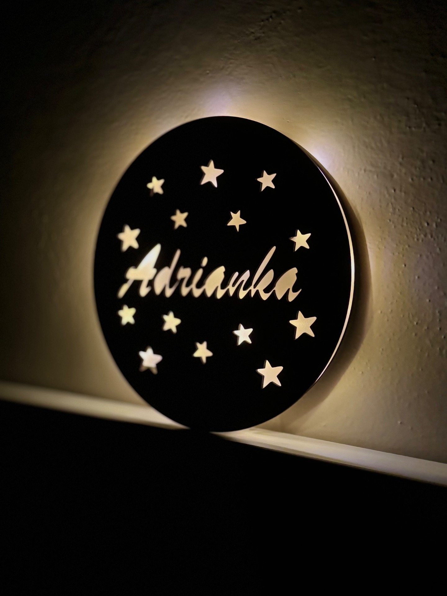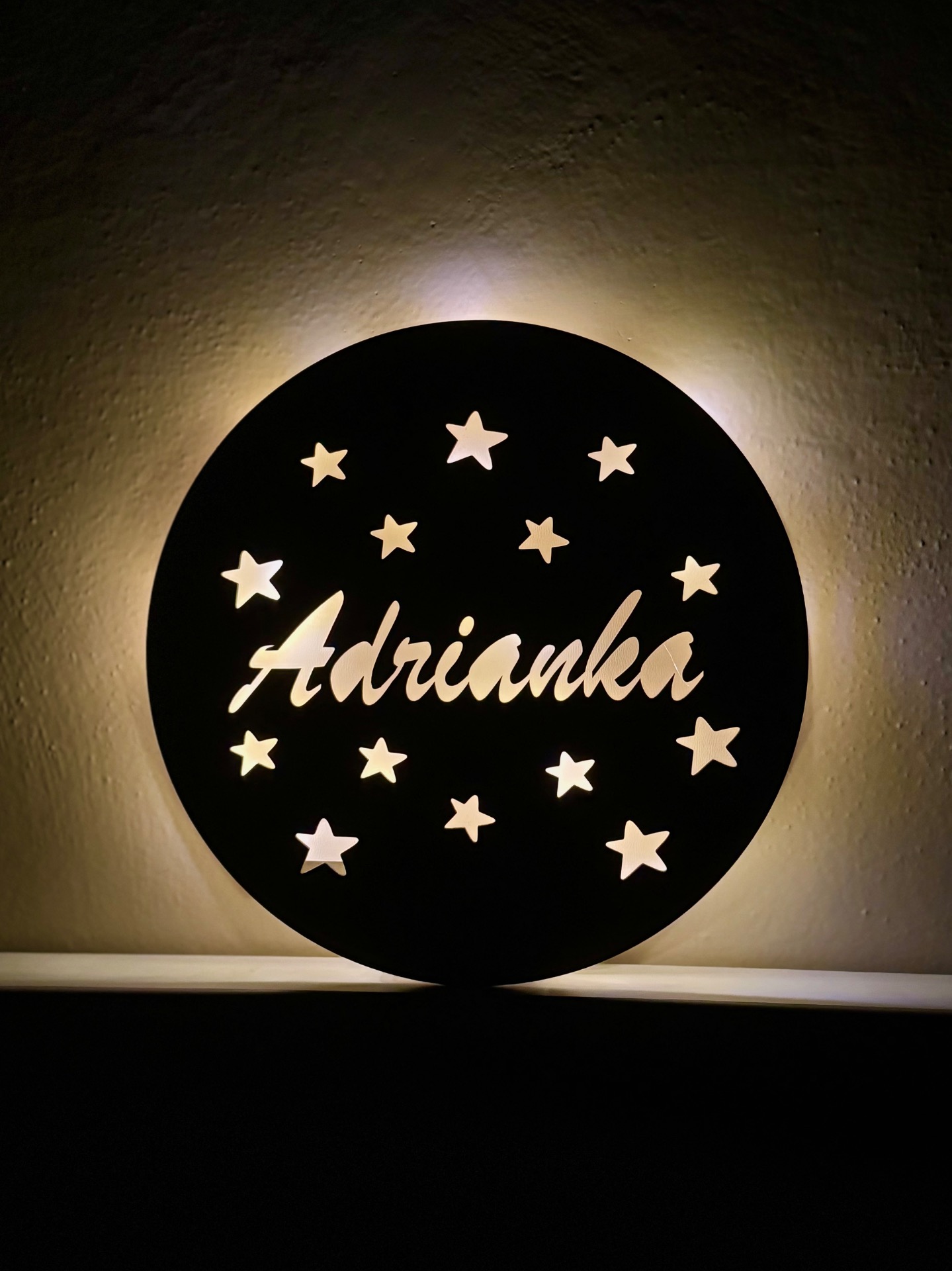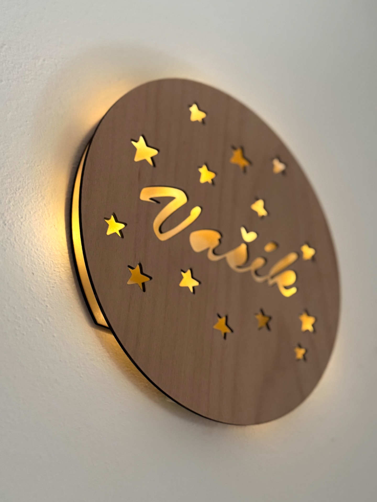 Každý kousek je vyráběn na zakázku – se jménem dle vašeho přání, takže se stane jedinečnou dekorací i krásným dárkem. Lampička je určena k zavěšení na zeď, na zadní straně má praktické otvory pro snadné uchycení. Osvětlení funguje na baterie (nejsou součástí balení), které lze pohodlně vyměnit.