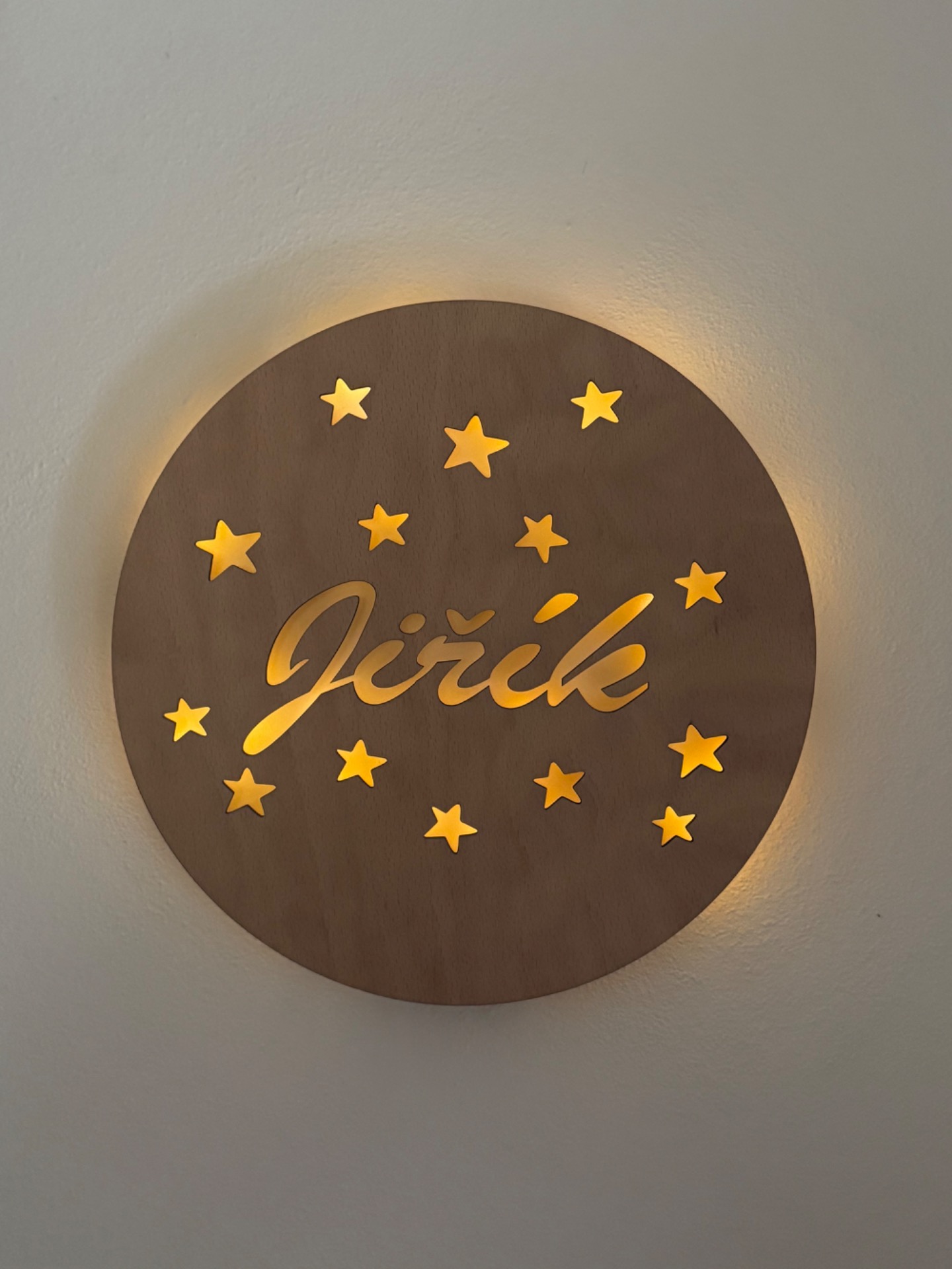 - Originální personalizace – vyrobíme se jménem dle vašeho přání- Elegantní vzhled i ve dne – přední část je z přírodního dřeva, zadní strana z bílé desky, takže lampička působí čistě a stylově i když není rozsvícená.